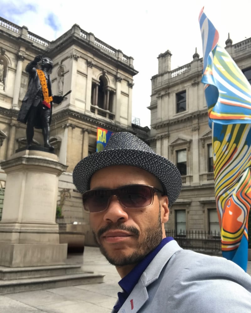 Me entering a previous Summer Exhibition with Yinka Shonibare works in the background at the Royal Academy of Arts in London.
